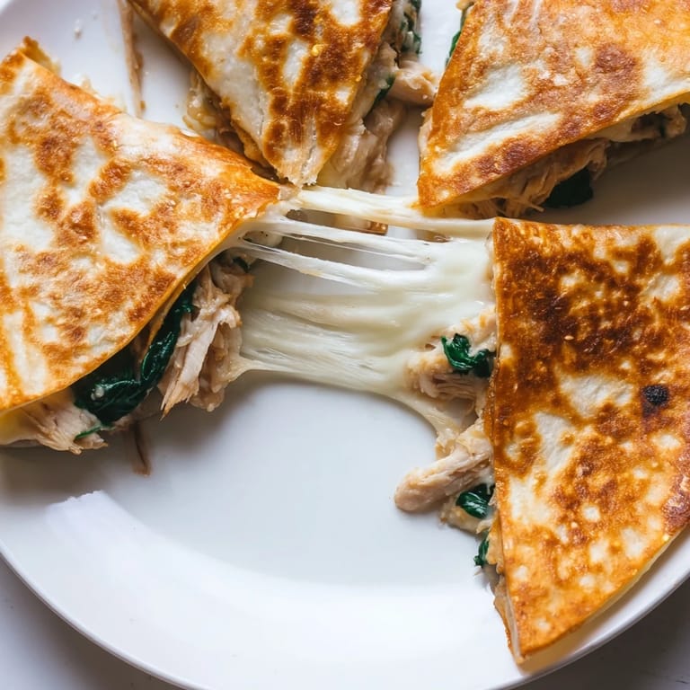 Pin it The skillet was too hot, and I panicked. My first quesadilla came out charred on one side, cheese barely melted on the other. But by the third try, I figured out the rhythm: medium heat, patience, and a quick flip. Now, these chicken and spinach quesadillas are my go-to when I need something fast, filling, and impossible to mess up once you know the trick.