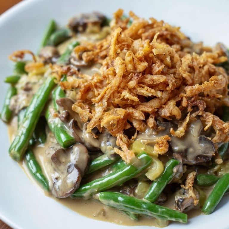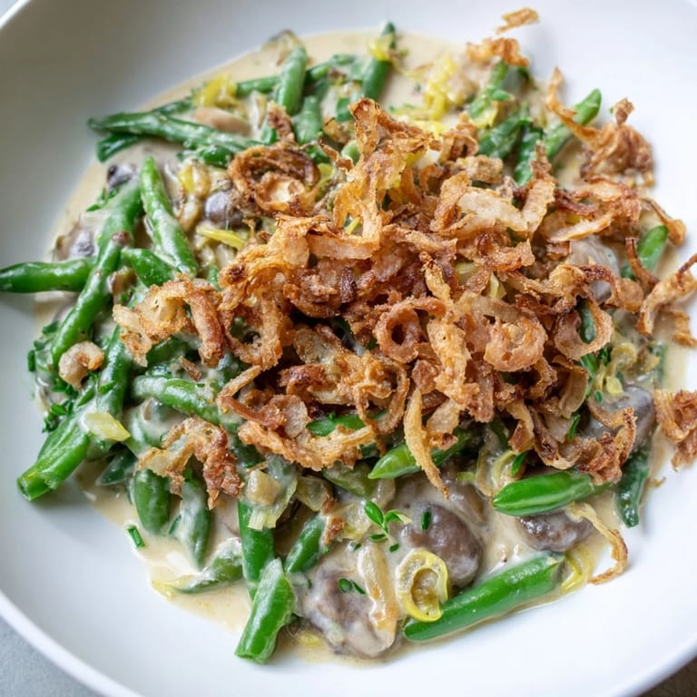Pin it Every November, without fail, my aunt would arrive at our kitchen door with this green bean casserole in her hands, still warm from her car ride. The creamy mushroom sauce and those golden fried onions on top became the signal that the holidays had officially begun. Years later, I finally asked her for the recipe, and what I discovered was simpler and more elegant than I expected—just tender green beans, a silky sauce, and that addictive crispy topping that made everyone reach for seconds.